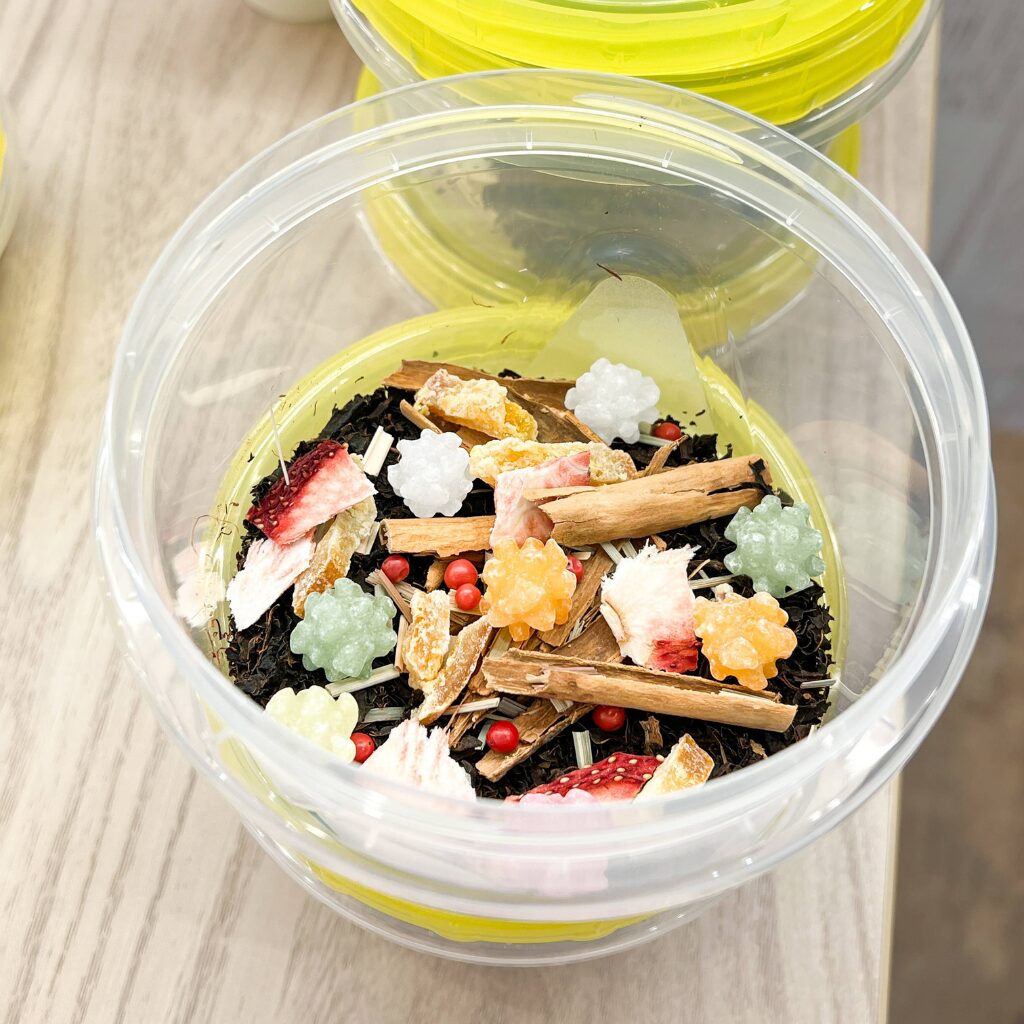 茶葉と組み合わせたときに、スパイスやハーブが果たす役割を整理しながら、方向性の違う2種のブレンドを試飲していただきました。ひとつは軽やかで華やかなテイスト、甘みも加えて。もうひとつは、冬らしいコクとスパイス感を強めに。ドライフルーツも加えることで、茶葉のフルーティーさを活かすブレンドに仕上げました。