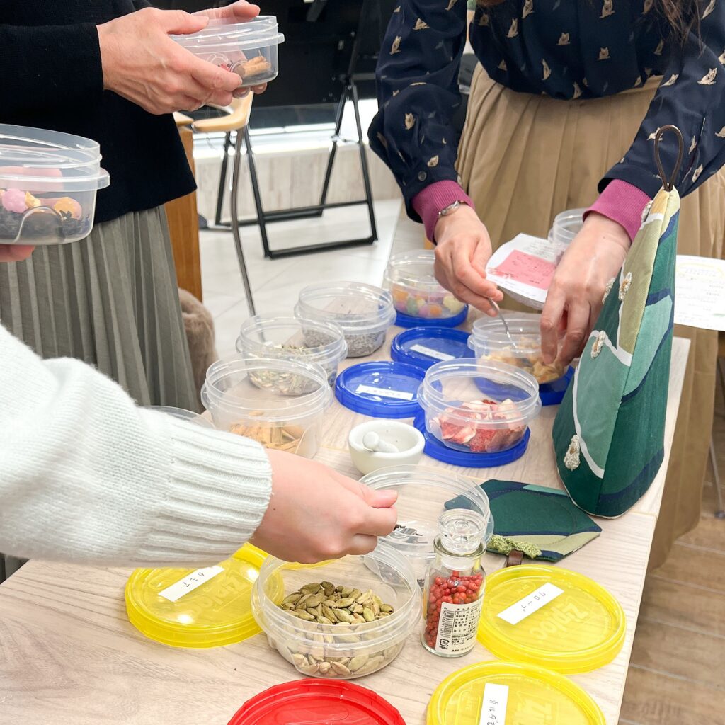 スパイス5種、ハーブ2種、ドライフルーツ2種を自由に組み合わせながら、各自が自由にブレンド体験。会場にスパイスやハーブの香りが溢れ、お客様同士の会話にも花が咲きました。